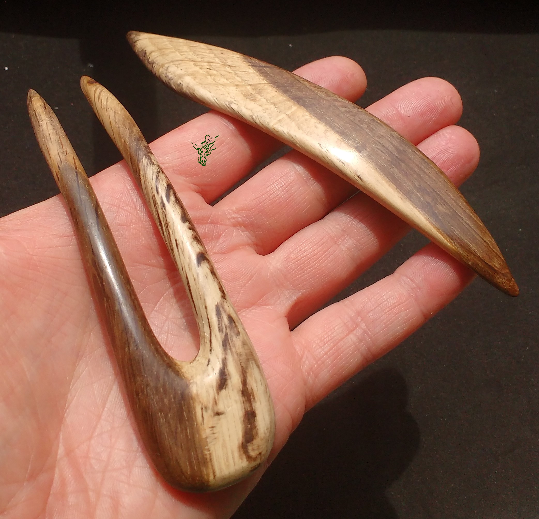Typische Situation. Diesmal entdeckt der irre Holzblick vom Jadedrachen einen Ast, und ich weiß genau, dass es Esche ist. Und vor allem ist sofort zu erkennen, dass es sich um die seltene Ausprägung OlivEsche handelt, also OlivenHolz- ähnliche Maserung und dunkle Oliv- Farbe im Kern. Darauf freue ich mich schon seit 2 Jahren. Natürlich ist es nicht so einfach, eine Haarforke aus einem Ast zu schnitzen wie aus einem industriell gefertigten Brett zu sägen. Schicht für Schicht lege ich die Forke im Kern frei. Jede Schicht eröffnet neue Farben & Muster. Jippie, mein Herzchen klopft. Und ein verästeltes Loch habe ich mit dunkelblauem Epoxid aufgefüllt, einfach weils schön aussieht 🙂 Feinschliff & Polieren & der Jadedrache erfreut sich am Glanz. So liebe ich es!