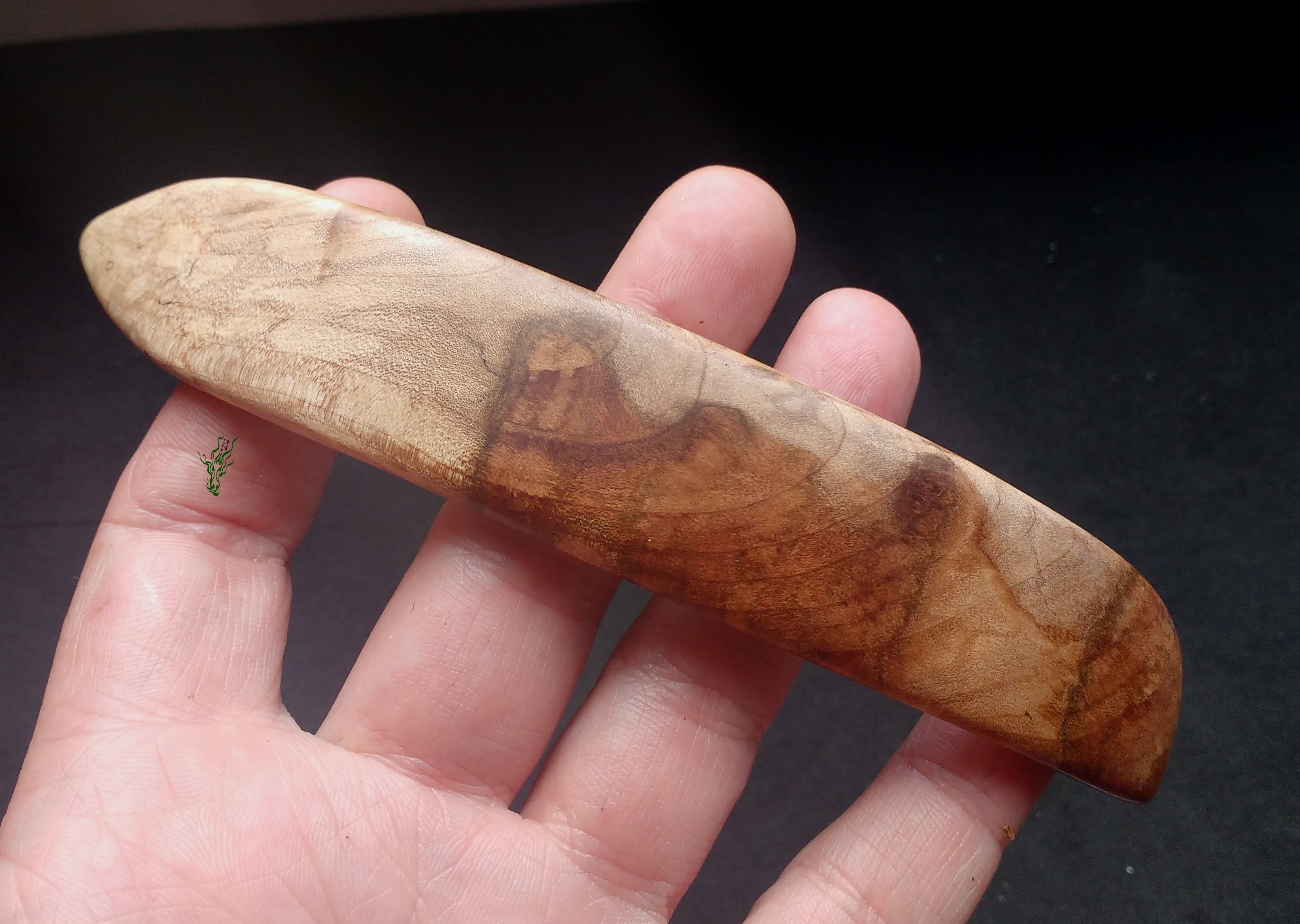 Ich habe Rüster gefunden, mittlerweile selten in Deutschland, weil wir ein Schädlings-bedingtes Ulmensterben haben 🙁 Das Holzgebilde ist so verwachsen, dass ich kaum eine Chance habe, irgendeine Haarschmuck – taugliche Stelle zu finden. Ich will aber! 😀 Am Ende habe ich alles auf Haarstabgröße geschrumpft – ein kleines Wunderwerk der Natur. Hochglanz inklusive. Hachmach!