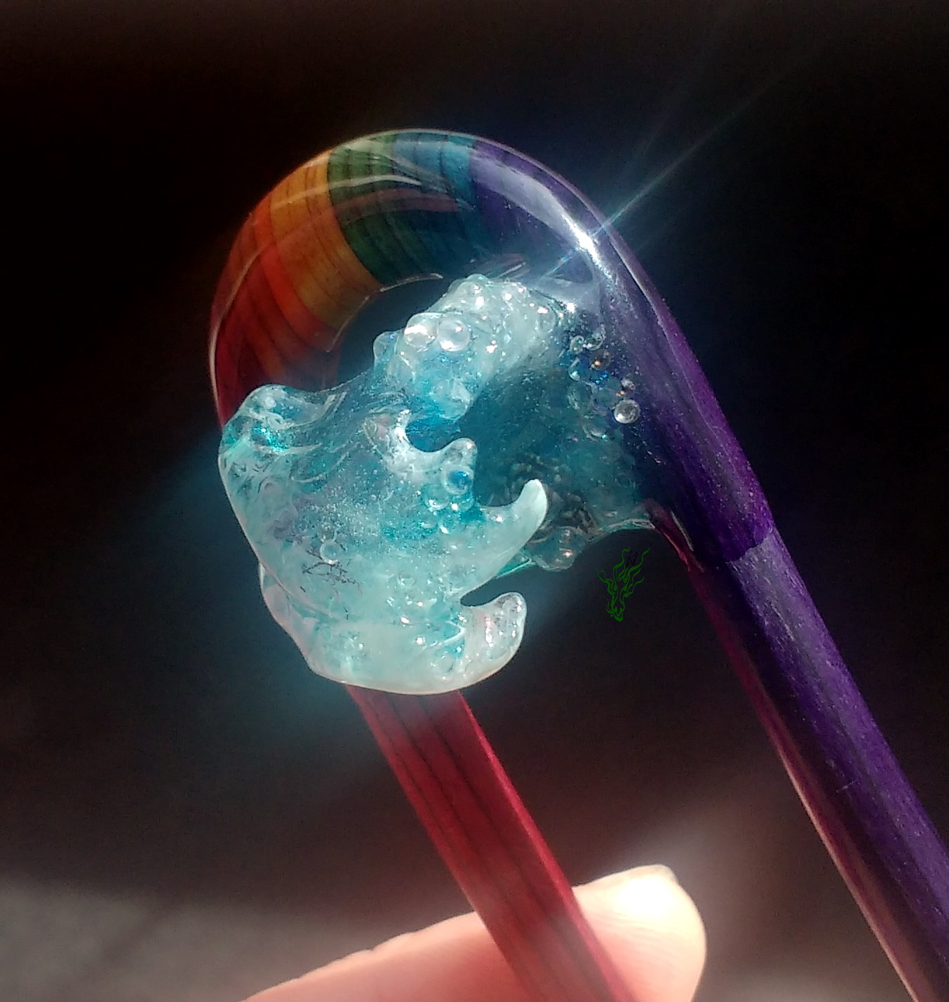 Dann habe ich diese Haarnadel daraus geschnitzt. Was für ein liebes Geschöpf – ich habe ihm farbwechselnde Augen mit Drachenschuppen gegeben