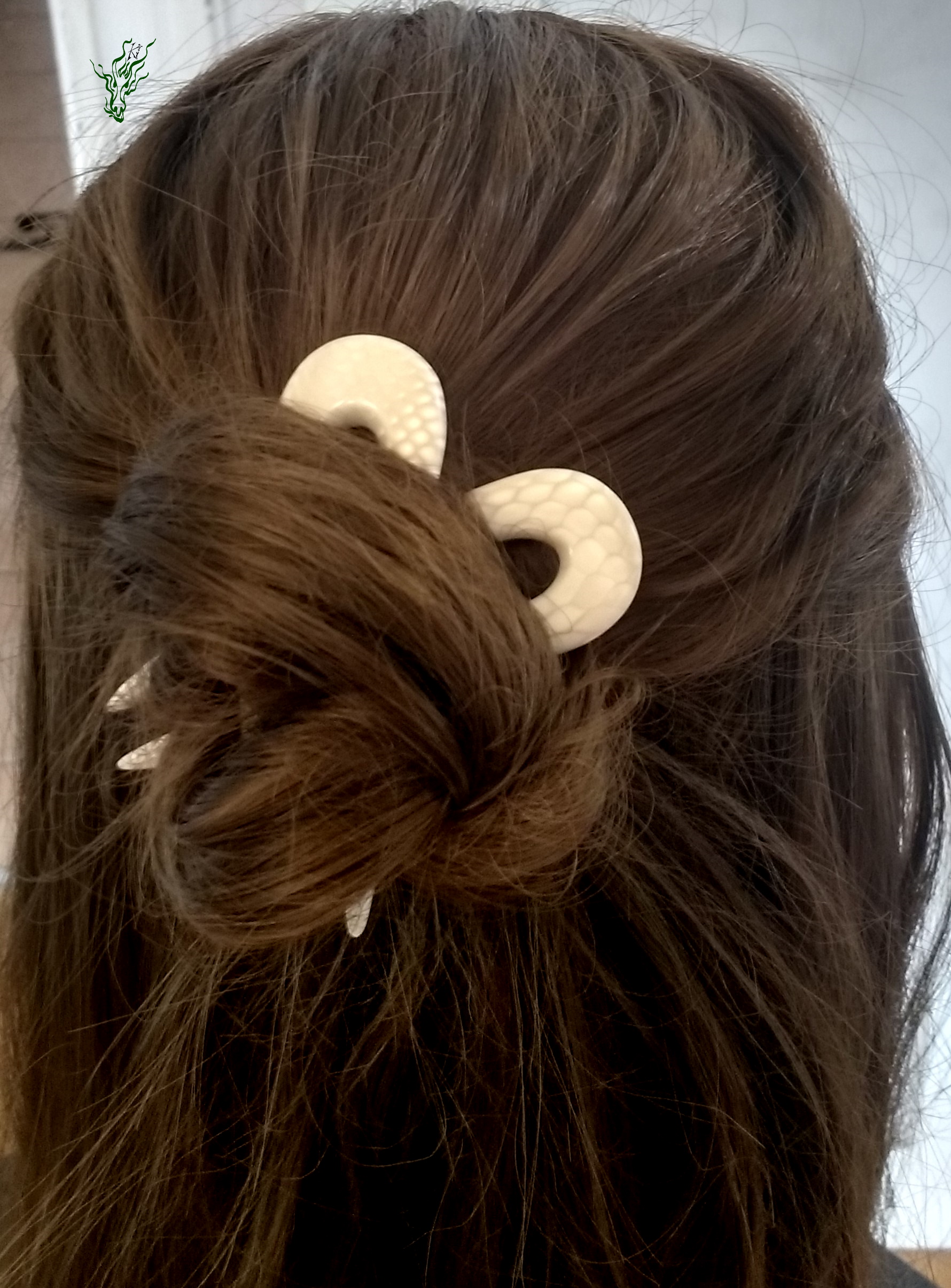 Hmm, wird das funktionieren?, dachte ich, als ich diesen Haarschmuck schnitzte. Aber die Form wollte einfach raus. 😀