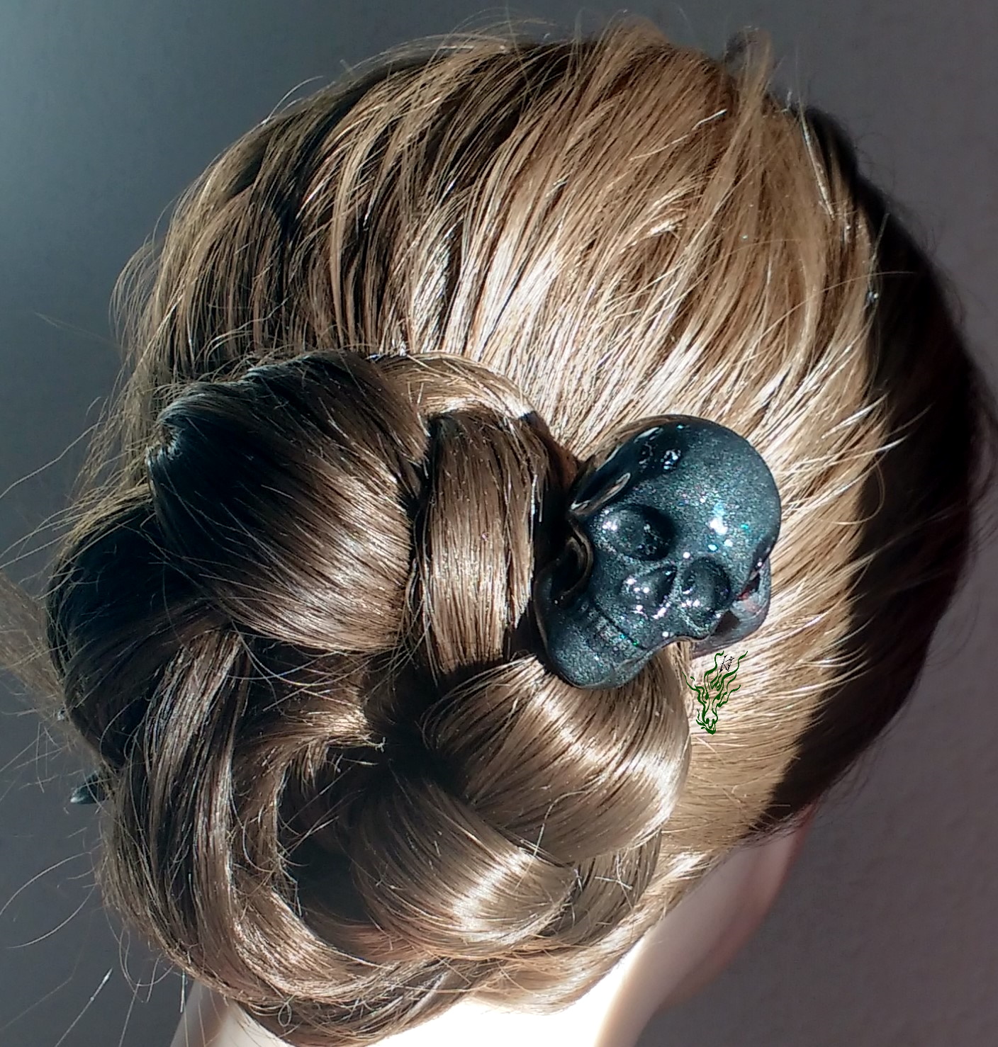 Ich habe diese Totenschädel aus Resin geschnitzt, sie mit echten Farnblättern umwickelt und in Kupfer verwandelt. Jeder Haarstab hat einen funktionalen Teil, der in Zickzackform geschmiedet ist und stabil genug ist, um den Dutt sicher zu halten.