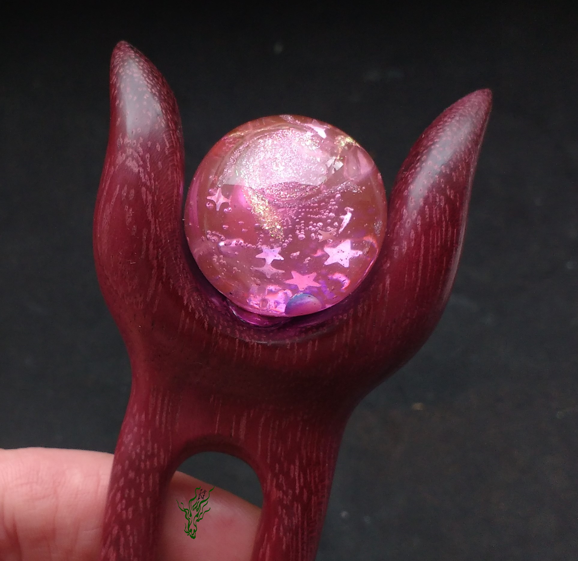 Geschmiedet aus Upcycling-Kupfer zu einer Haargabel, die in Kopfform gebogen ist, um perfekt mit deiner Hochsteckfrisur zu verschmelzen, mit einem Topper, der sich dekorativ über deinen Dutt legt.